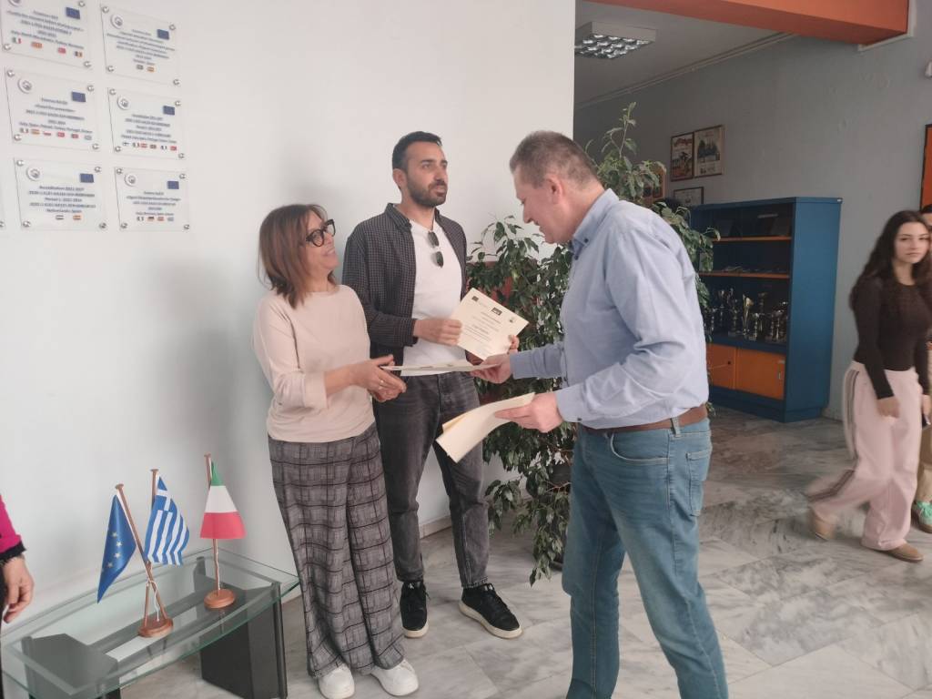 Από 23/3/2026 έως 27/3/2026 φιλοξενήθηκε στο σχολείο μας μια αποστολή καθηγητών από την πόλη Ροσσάνο της Ιταλίας στο πλαίσιο erasmus+ για Jοβ Shadowing. Οι Ιταλοί συνάδερφοι ενημερώθηκαν για το ελληνικό εκπαιδευτικό σύστημα ενώ ταυτόχρονα παρακολούθησαν μαθήματα Αγγλικών, λατινικών, Ιστορίας, Αρχαίων Ελληνικών.